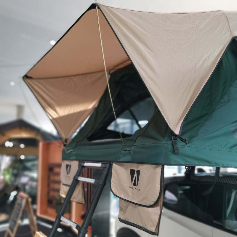 In Dein SMALL WILLOW kletterst Du über die Teleskop-Aluminiumleiter, die Du individuell für Deine Fahrzeughöhe einstellen kannst. Deine Schuhe verstaust Du ganz bequem in den beiden Schuhtaschen neben dem Zelteingang.