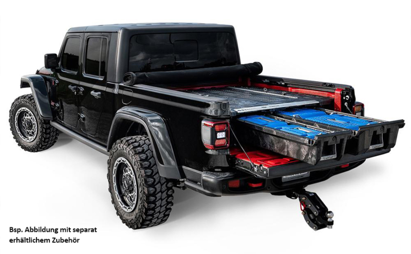 Decked Schubladen helfen Ihre Ladefläche zu organisieren und ermöglichen den sinnvollen Transport von z. B. Werkzeug, Jagd-, Camping- & Sportausrüstung ohne dabei die Idee des "Pickup" einzuschränken. Eine weitere Abdeckung wie z. B. durch ein Hardtop, oder Tonneau Cover (Ladeflächendeckel) ist nicht zwingend notwendig.