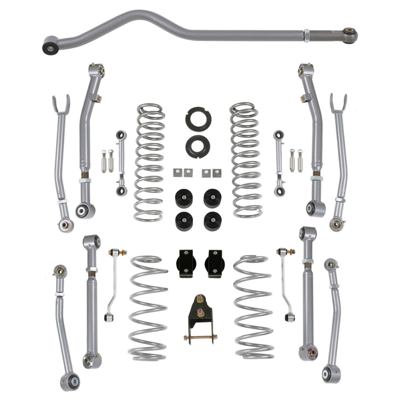 Die perfekt abgestimmten Federn bieten höchstes Fahrvergnügen, egal ob on- oder off road. Durch die 8 einstellbaren Super Flex Längslenker kann das Fahrzeug präzise abgestimmt werden, für ein perfektes Fahrverhalten. Die Achsanschläge und Stabistangen vorne wie hinten runden dieses Kit perfekt ab.