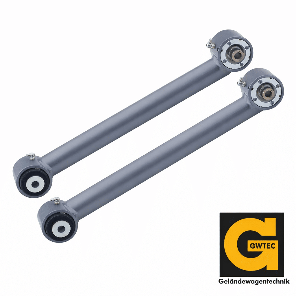 Die Längslenker sind besonders robust ausgeführt und verfügen einseitig über Rubicon Express SuperFlex Gelenke, die eine deutlich größere Beweglichkeit ermöglichen als serienmäßige Buchsen. Dadurch wird die Achsenverschränkung im Offroad-Einsatz optimiert, während auf der anderen Seite eine langlebige Buchse für ruhigen Lauf sorgt.