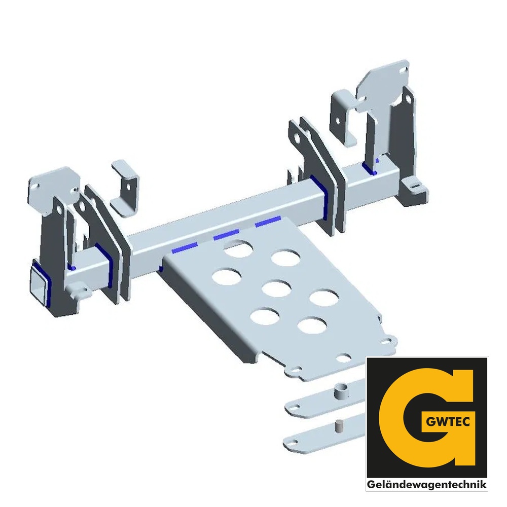 Der Montagerahmen ist fahrzeugspezifisch konstruiert und ermöglicht eine stabile, verwindungssteife Anbindung des Schneepflugträgers an die Fahrzeugstruktur.