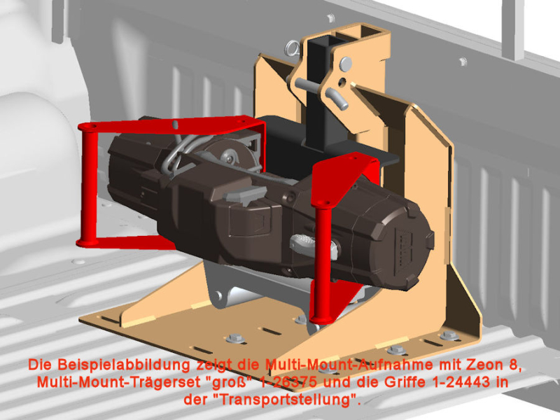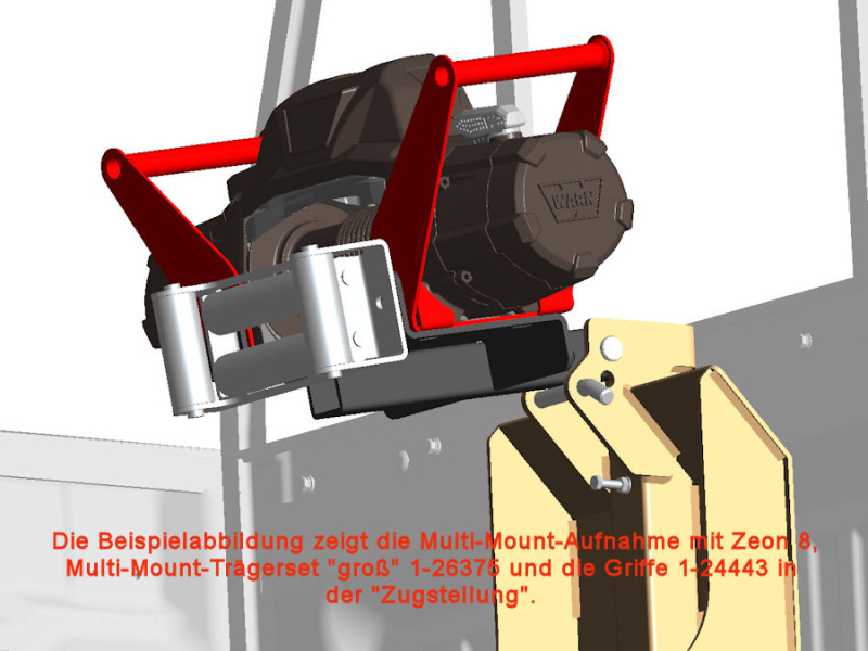 Die Multimount Aufnahme dient sowohl als Transportaufnahme, sowie als Zugvorrichtung bis max. 500 kg. Hierzu muss lediglich ein Bolzen gelöst, die Seilwinde in die Zugposition nach oben geschwenkt und erneut durch den Bolzen gesichert werden.