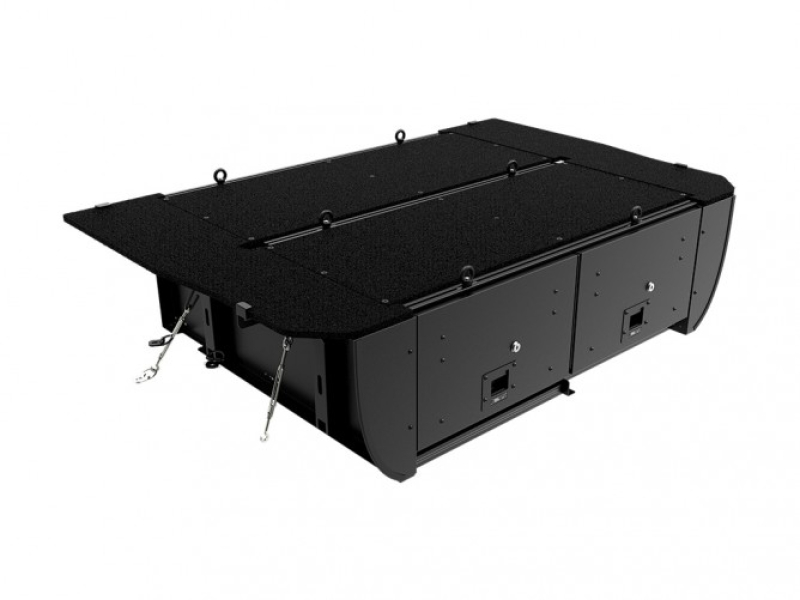 - Das Schubladen Kit kann innerhalb von Minuten montiert werden, indem die Karabiner und Spannschlösser an den vorhandenen Befestigungspunkten im Fahrzeug und den Schubladenhalterungen befestigt werden. Das Entfernen der Schubladen ist ebenso einfach.